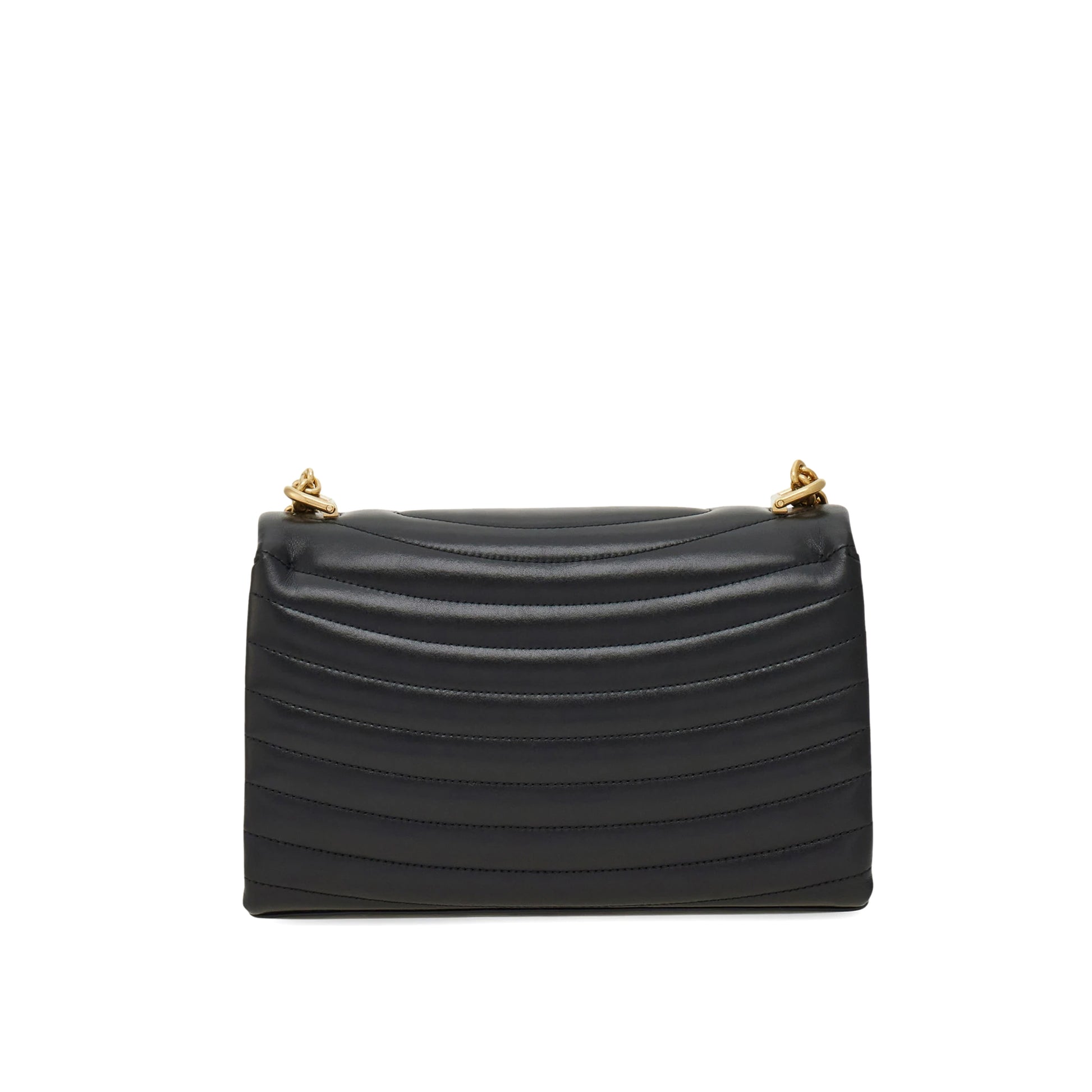 Ladylike and luxurious, the rippled, padded leather of this chic Ferragamo handbag emphasizes the soft finish of the Italian calfskin. Inspired by the Rainbow Shoe designed by Salvatore Ferragamo for Judy Garland in 1938, the rippling is punctured at the top by two golden Gancio buckles that hold the golden chain strap with leather insert, and on the front flap by a golden Gancio clasp. A new contemporary icon.
