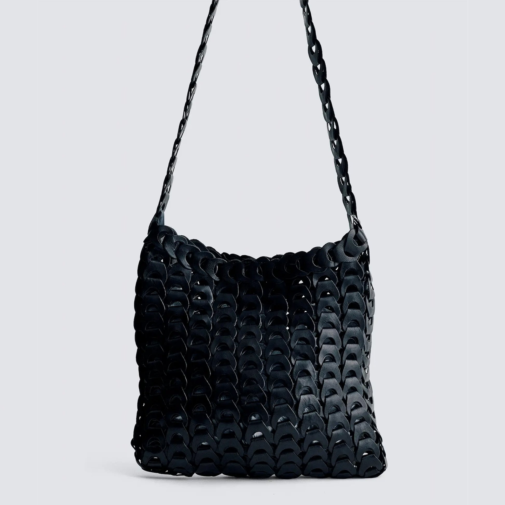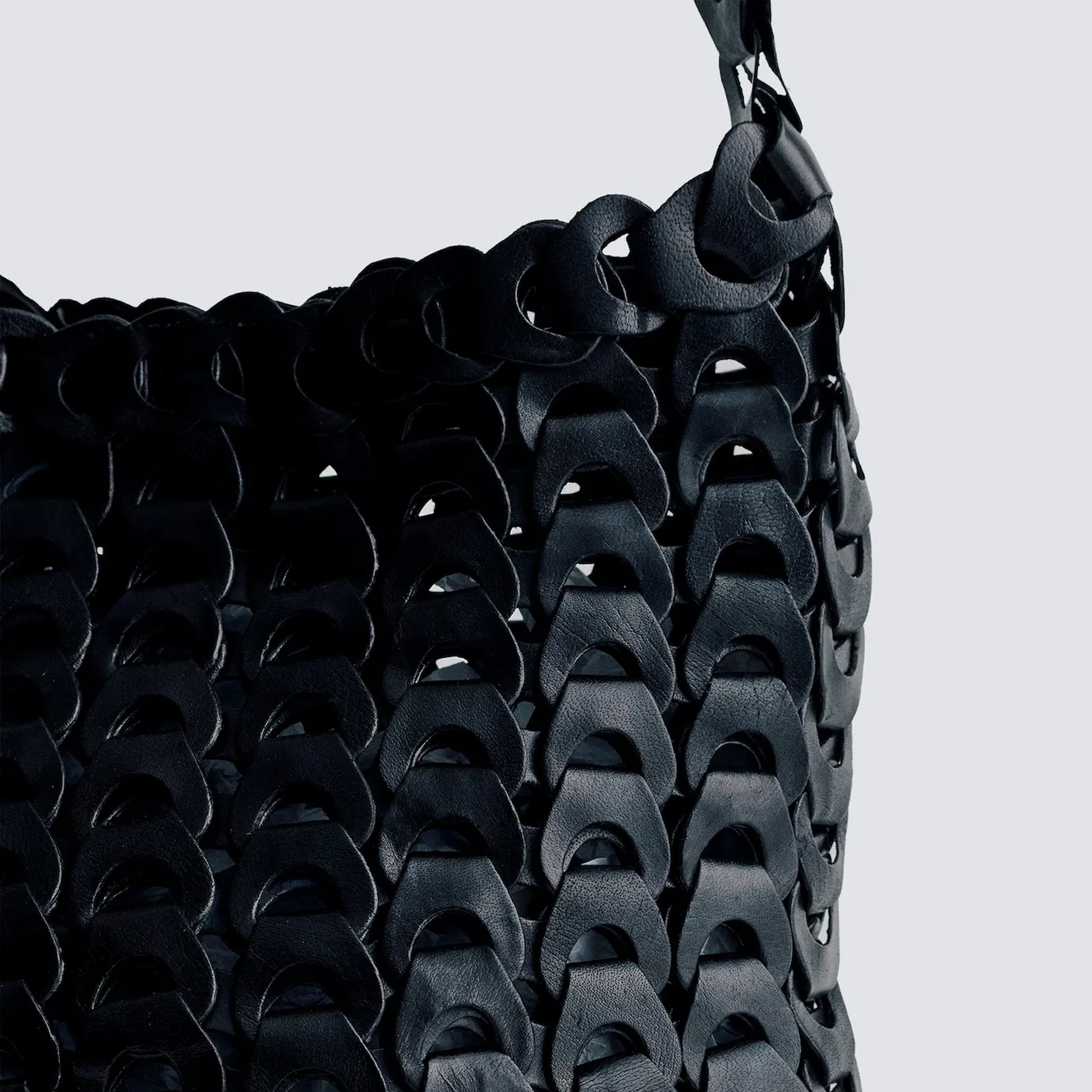 The "NS Link Tote" showcases innovative design and sustainability, crafted from surplus recycled buffalo leather that's both supple and eco-friendly. This tote features unique straps that form leather medallions, linked together like a chain, creating a distinctive, textured look. Versatile in its styling, it can be worn over the shoulder or as a crossbody, adapting effortlessly to your needs.