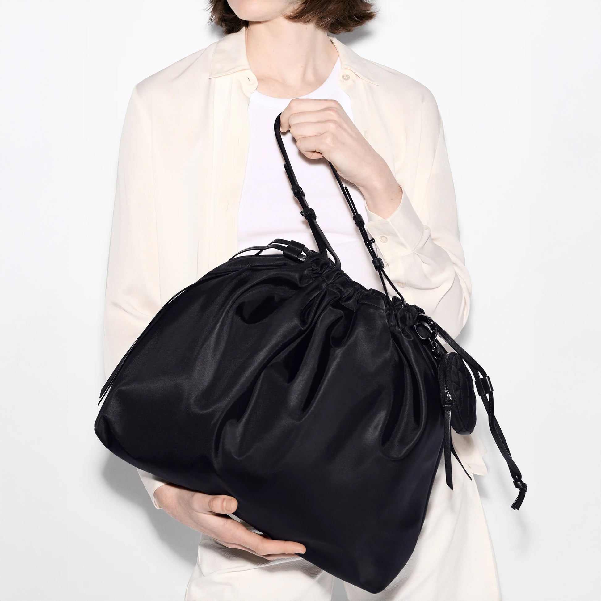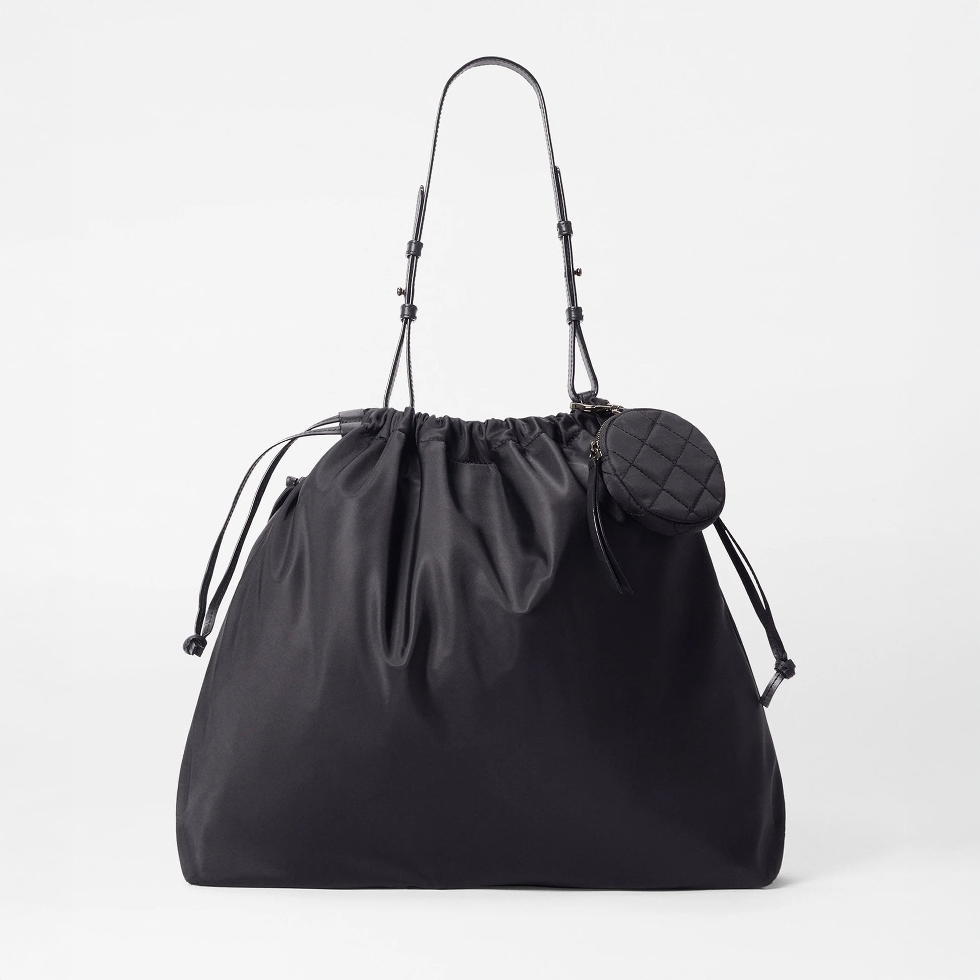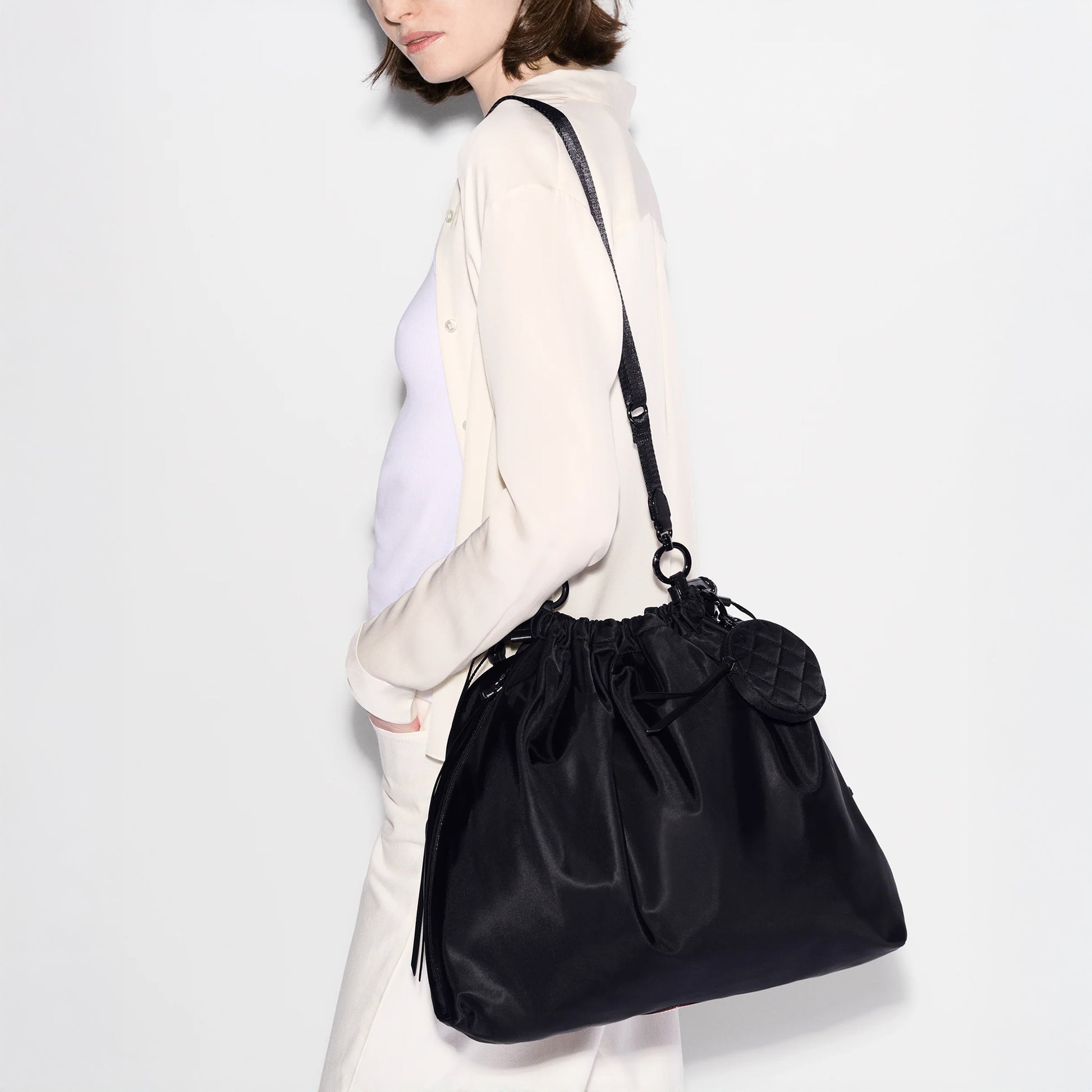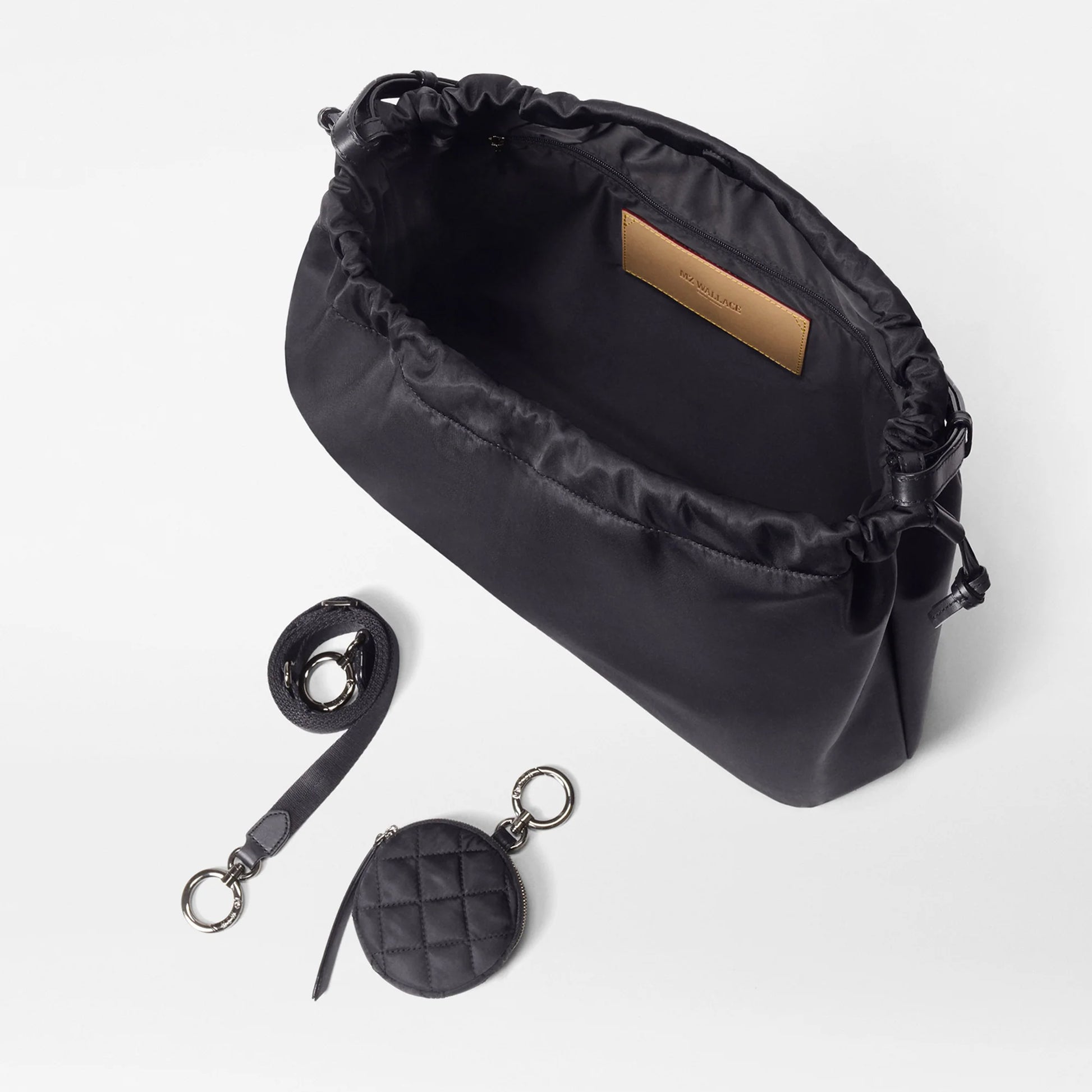 - Detachable, adjustable nylon crossbody strap
