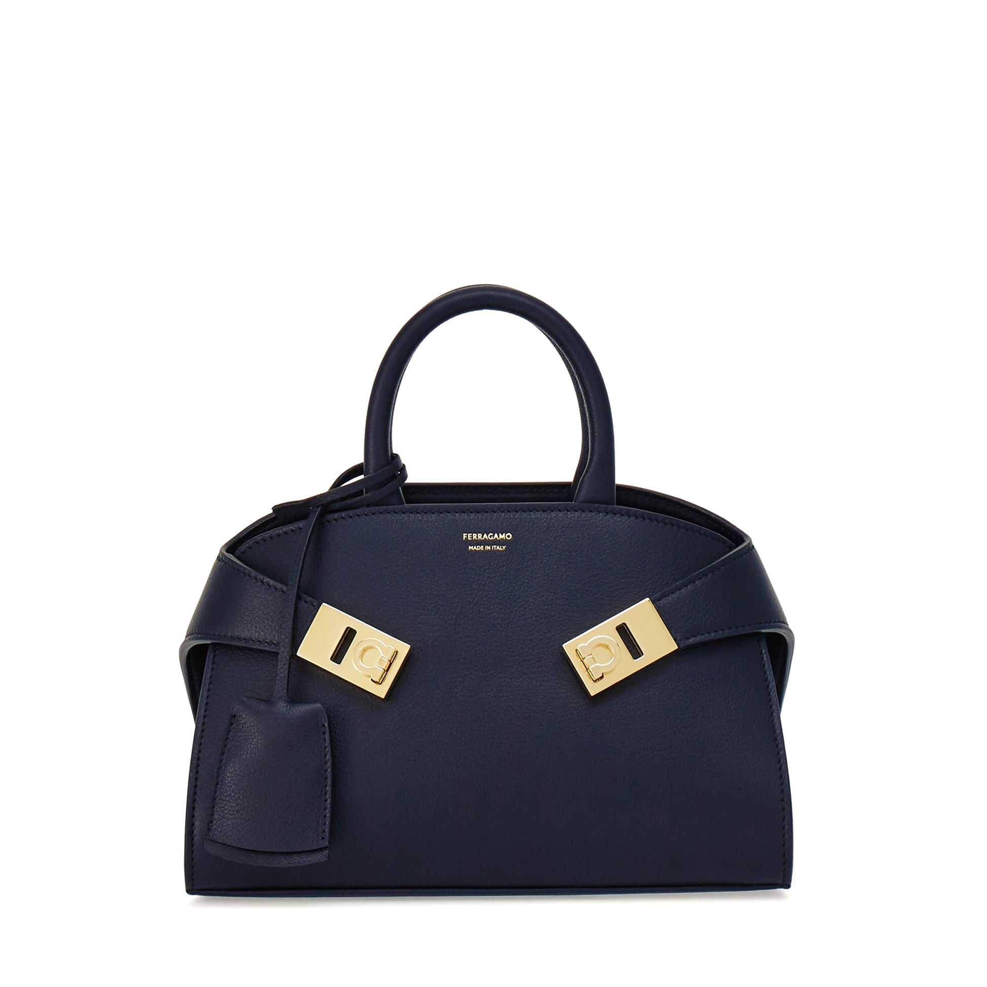 Made of the softest leather with a natural grainy texture, this compact version of the Hug bag is uptown style at its best. The rounded edges bring a softness to the rigid structure, echoed by the two straps that emanate from the back quadrant and wrap the billows, fastening at the front via two golden Gancio buckles. The look is ladylike contemporary, with a keychain charm on the zip ring, and detachable shoulder strap for handsfree styling. Signature foot studs protect the base.