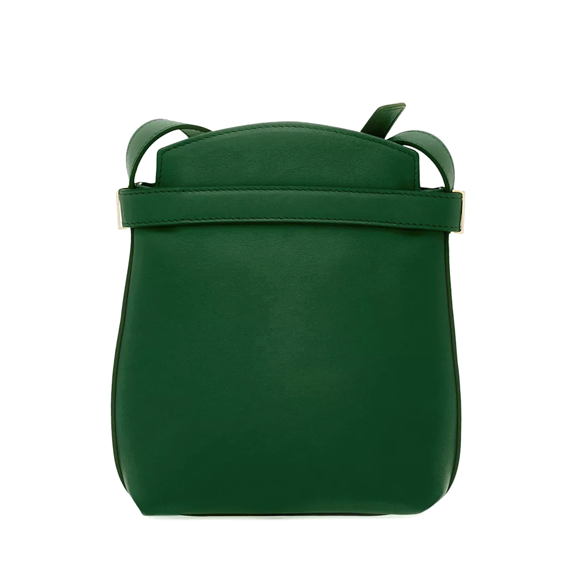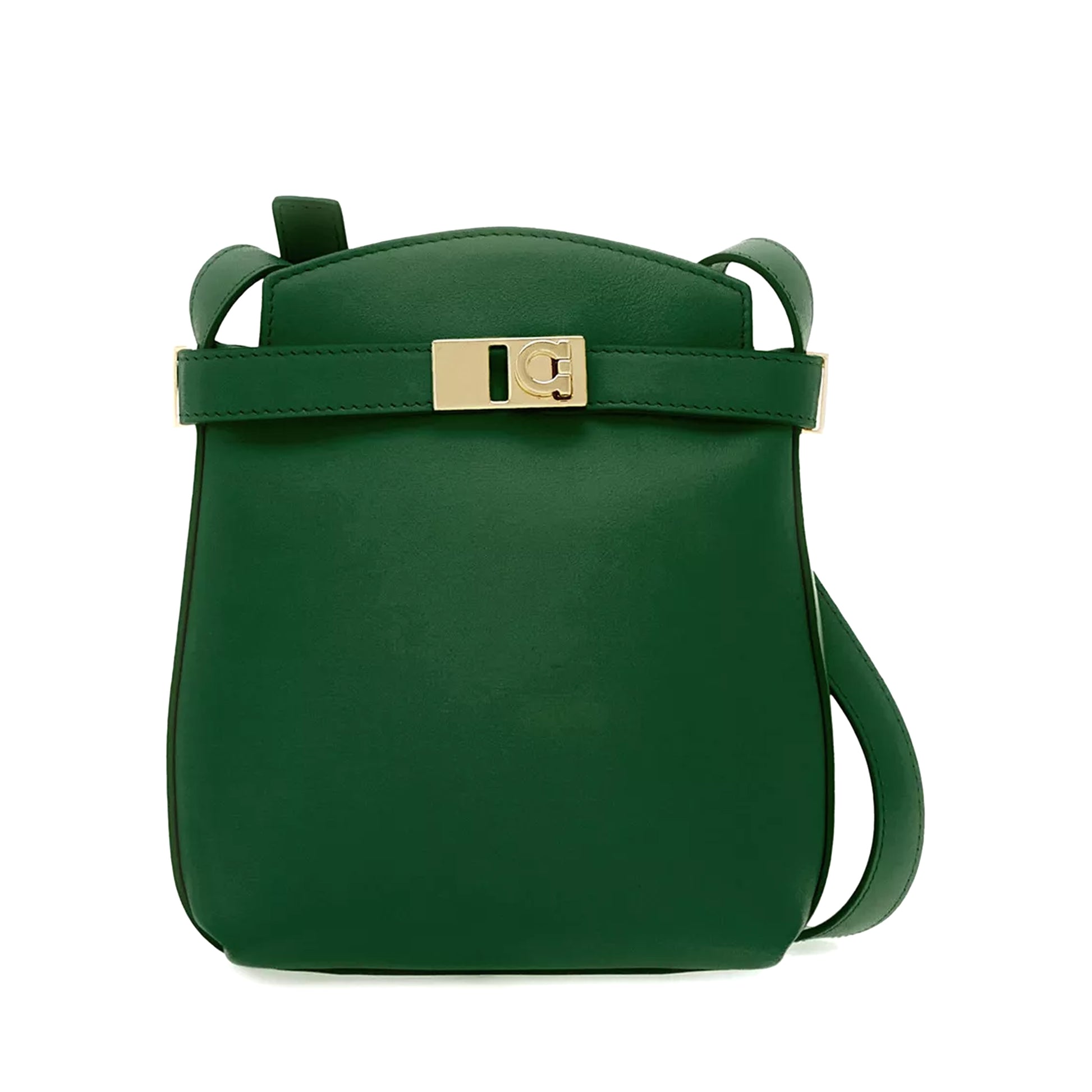Designed as a micro bag, this smartphone holder combines elegance with a feminine touch, ensuring full functionality. Crafted in smooth calfskin, it features a contrasting interior with slots for cards and badges. It fastens with a magnetic button, has an adjustable shoulder strap, and a band with a golden Gancini buckle along the edge.