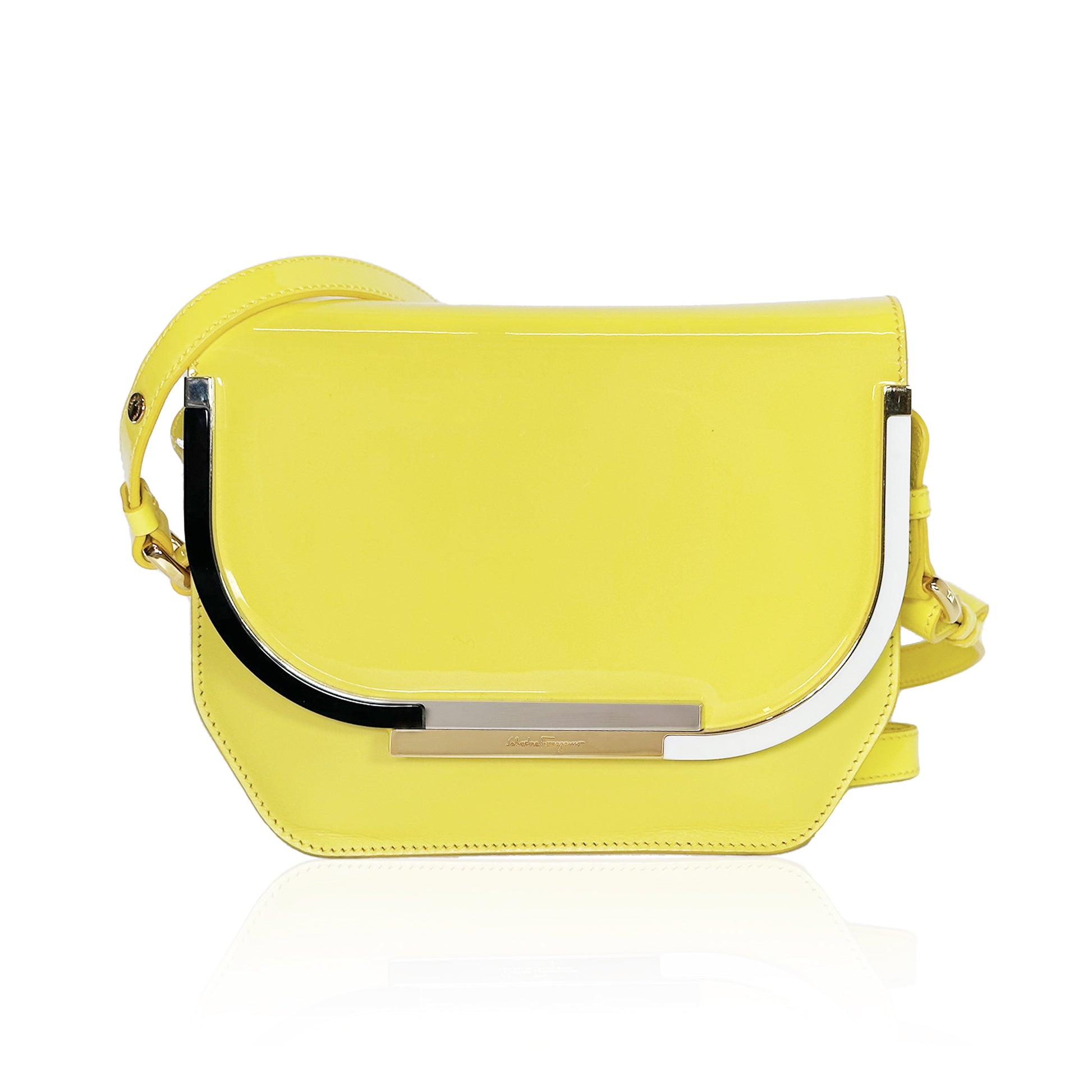 Yellow glossy patent shoulder bag with signature comtemporary colorblock bar design, gold branded hardware and black/white enmel.
