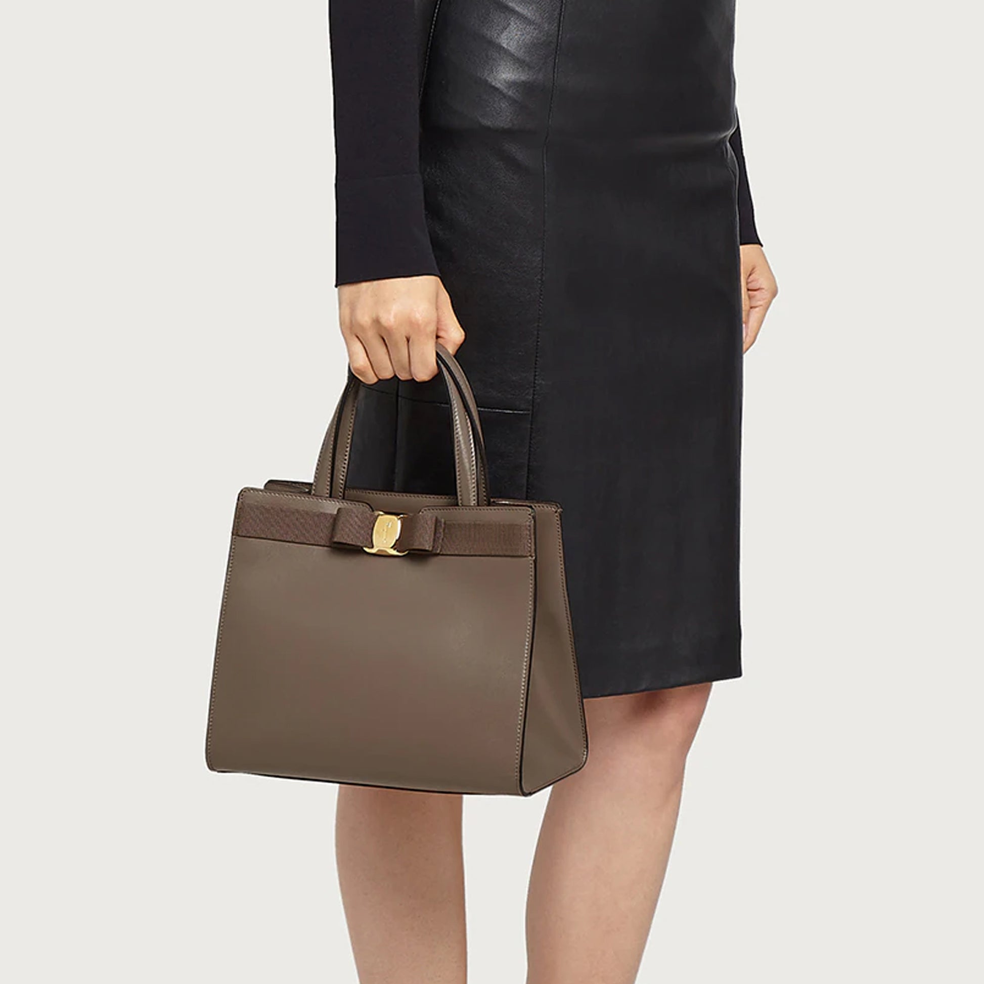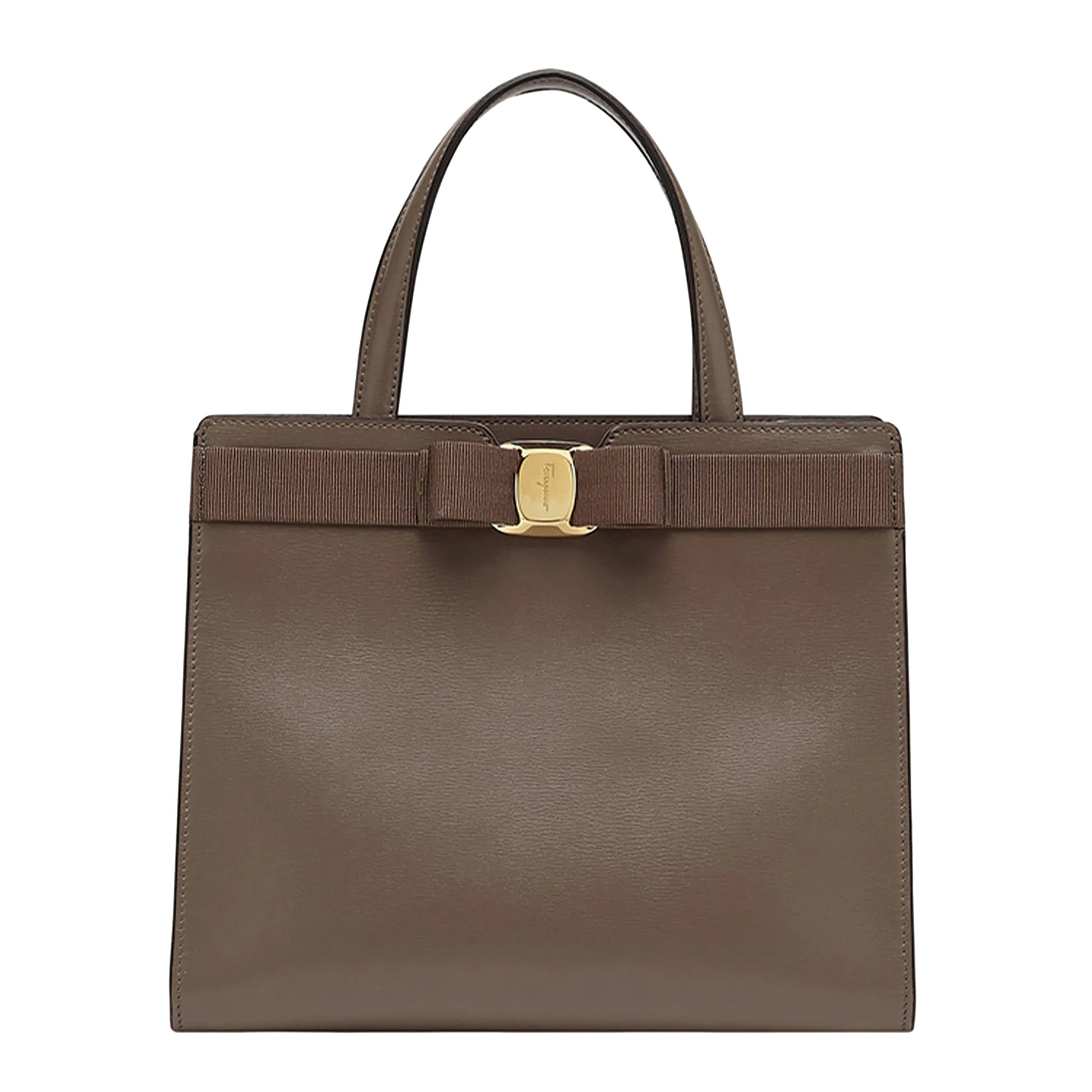 Add style and class to your everyday wear with this new Ferragamo top handle bag full of romantic charm and signature Brand details. Made of soft calfskin leather with a natural grain, it is decorated with a grosgrain insert and Vara bow with a central plate in golden metal. Lined interior with flat pockets for perfect functionality. Includes a detachable matching shoulder strap.