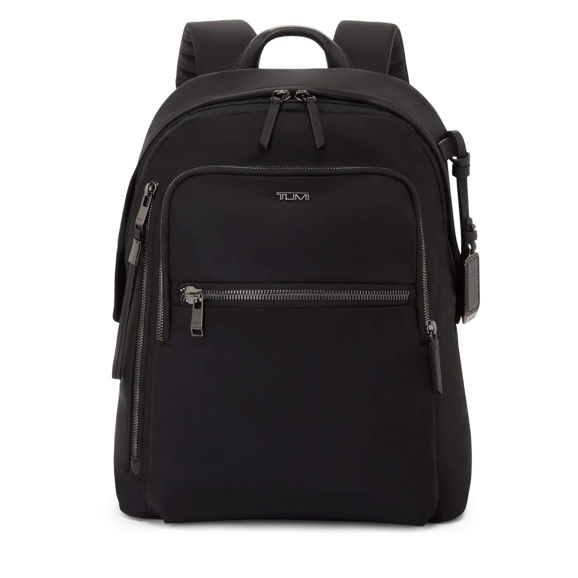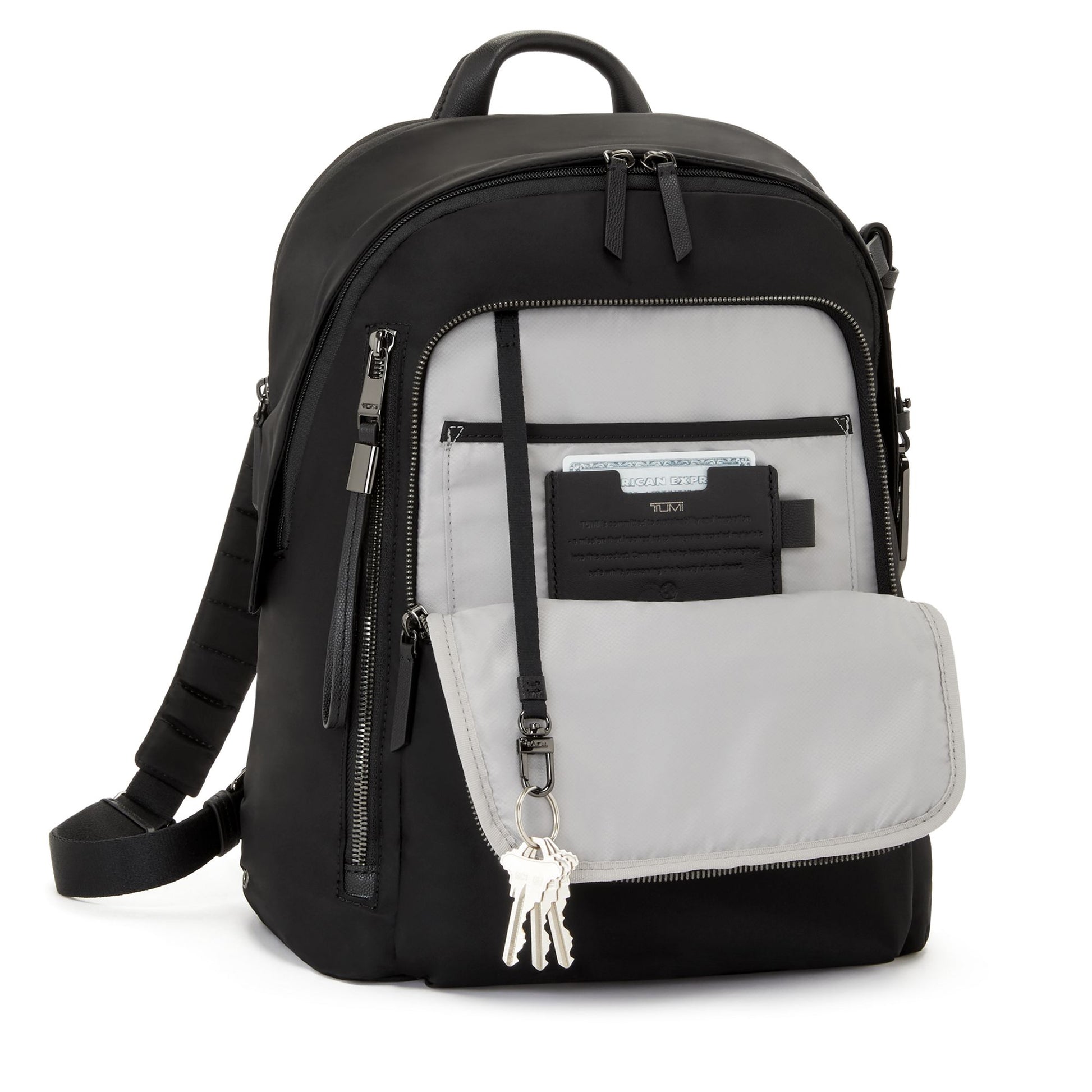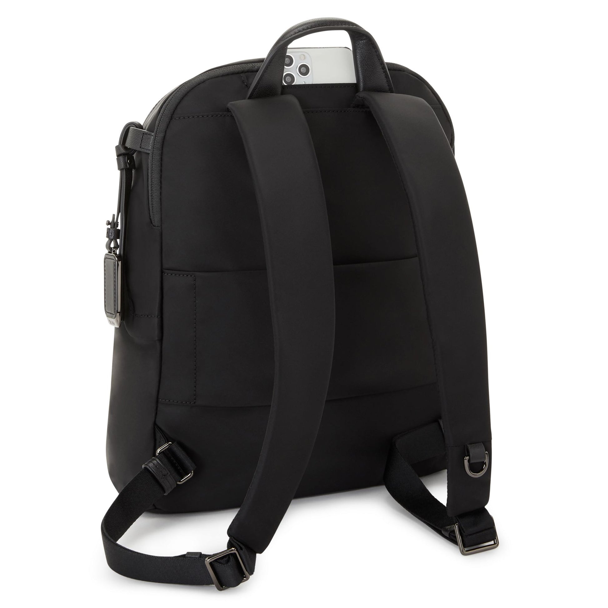 - Padded adjustable backpack straps with D-ring and loop compatible with select TUMI+ accessories*